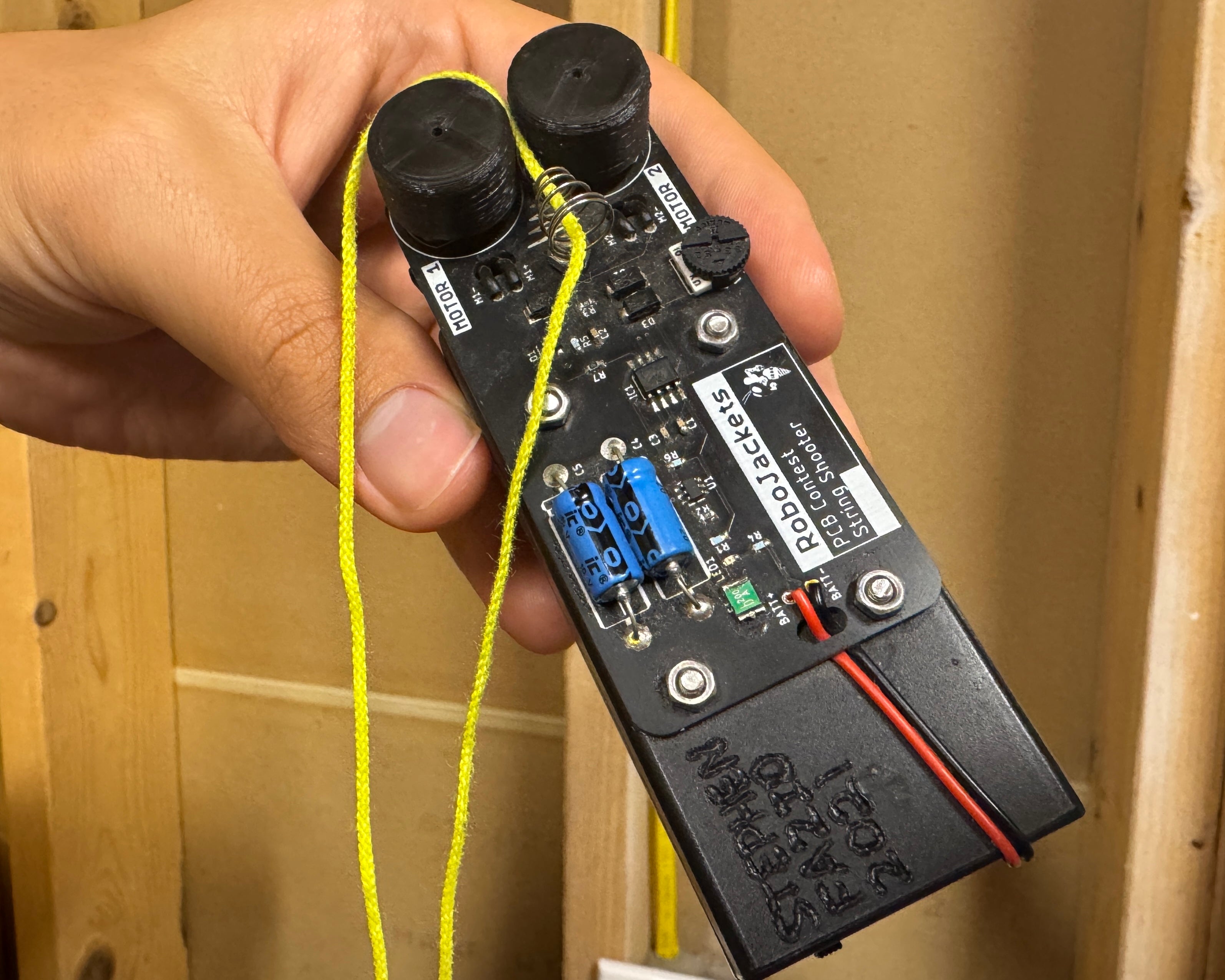 It all began in December 2020, when Georgia Tech student Stephen Fazio took on a class project with one rule: build a circuit board smaller than a credit card that can do anything! Inspired by a YouTube video from Bruce Yeany showcasing a bench-top string shooter, Stephen thought, “What if you could hold it in your hand and control it at its source?” So he did. Using his train card as the template, he built the world’s first handheld flying string shooter.